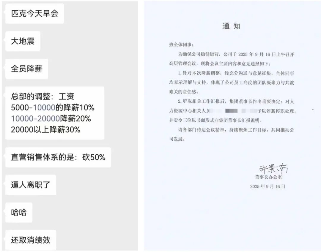 而在9月17日,匹克召开的“三观培训和加强内控管理”会议上,匹克董事长许景南回应称“网络爆料称匹克全员降薪”是不实消息。同时,强调降薪主要针对亏损部门和高薪岗位,并非全员降薪,整体降薪幅度不到10%,绩效等仍将保留。