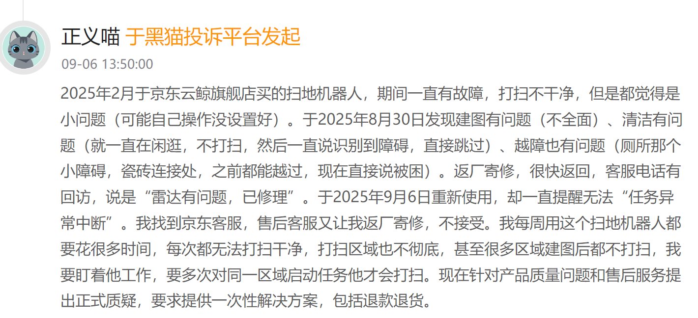 例如,有消费者于今年2月在云鲸旗舰店买的扫地机器人,期间一直有故障,打扫不干净,但是都觉得是小问题。然而,8月30日这名消费者发现建图、清洁、越障都出现了问题。经返厂寄修后,客服向消费者解释是产品雷达有问题,已修理。但当这位消费者再次使用时,却一直被提醒“任务异常中断”。