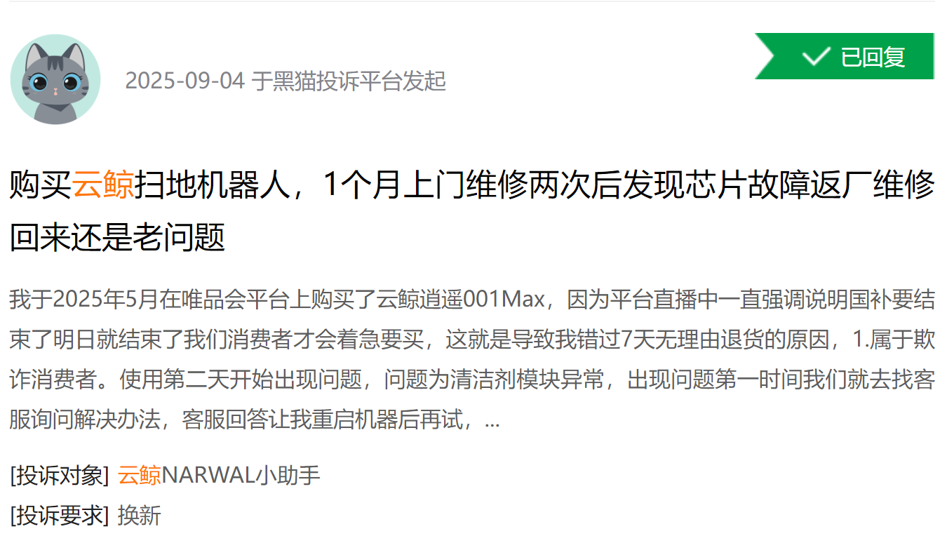 然而,新品发布热闹的背后,云鲸智能的产品质量问题也引发广泛关注。在黑猫投诉平台上,有关云鲸产品的投诉量已达数千条,消费者反馈的问题五花八门,从硬件故障到软件失灵,从清洁效果不佳到售后敷衍,影响了品牌形象与用户信任。