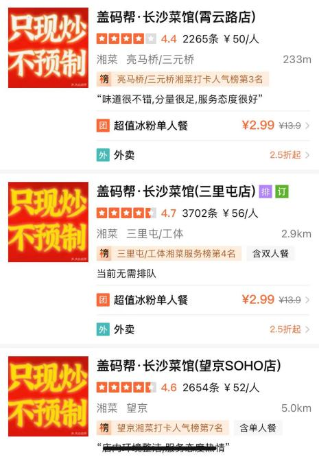 至于线上,在大众点评搜索“盖码帮”时能够看到,“只现炒 不预制”这六个字直接充当了品牌logo,就差追着消费者说“我们不是预制菜”了。