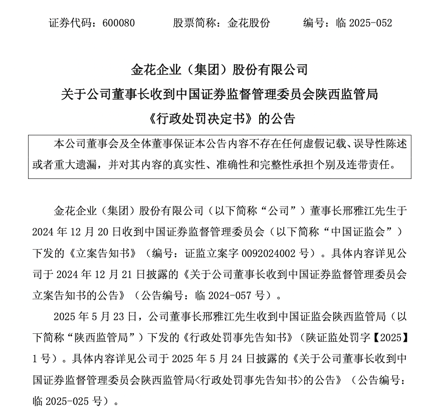 近日,金花企业(集团)股份有限公司(以下简称“金花股份”)发布公告称,其董事长邢雅江收到了陕西监管局下发的《行政处罚决定书》。