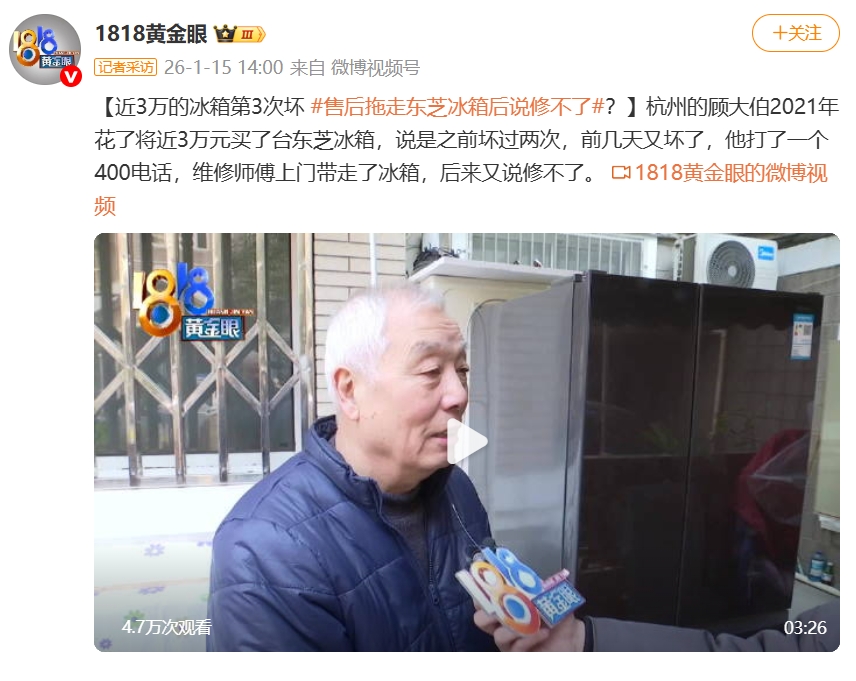 近日,根据1818黄金眼报道,有杭州消费者反映,其于2021年花费近三万元购买的东芝牌冰箱,在三年多时间里第三次出现制冷故障。