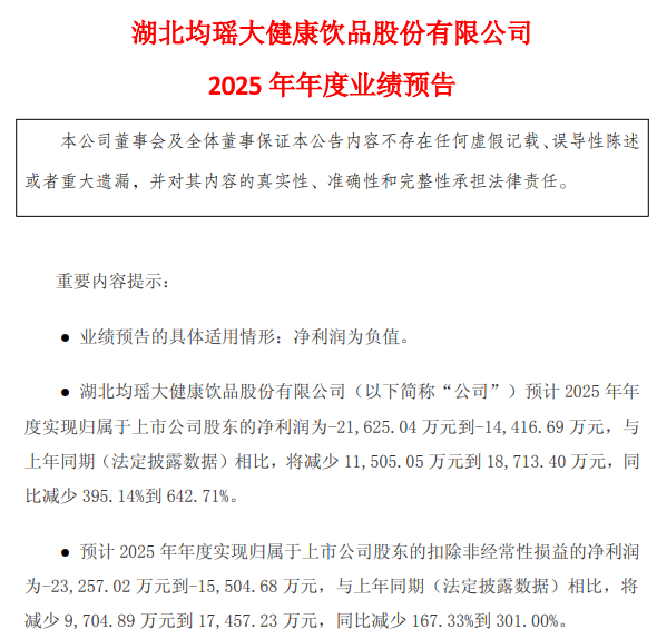 日前,均瑶健康发布2025年业绩预告,预计2025年实现归母净利润-2.16亿元到-1.44亿元,同比减少395.14%到642.71%;预计实现归母扣非净利润-2.33亿元到-1.55亿元,同比减少167.33%到301.00%。