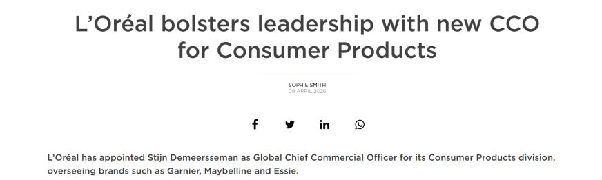 近日,据外媒TheIndustry.Beauty报道,欧莱雅集团宣布任命Stijn Demeersseman为消费品部门(即大众化妆品部门)全球首席商务官(COO),负责管理卡尼尔、美宝莲、Essie等品牌。